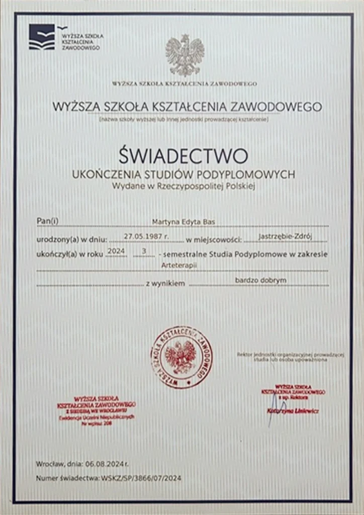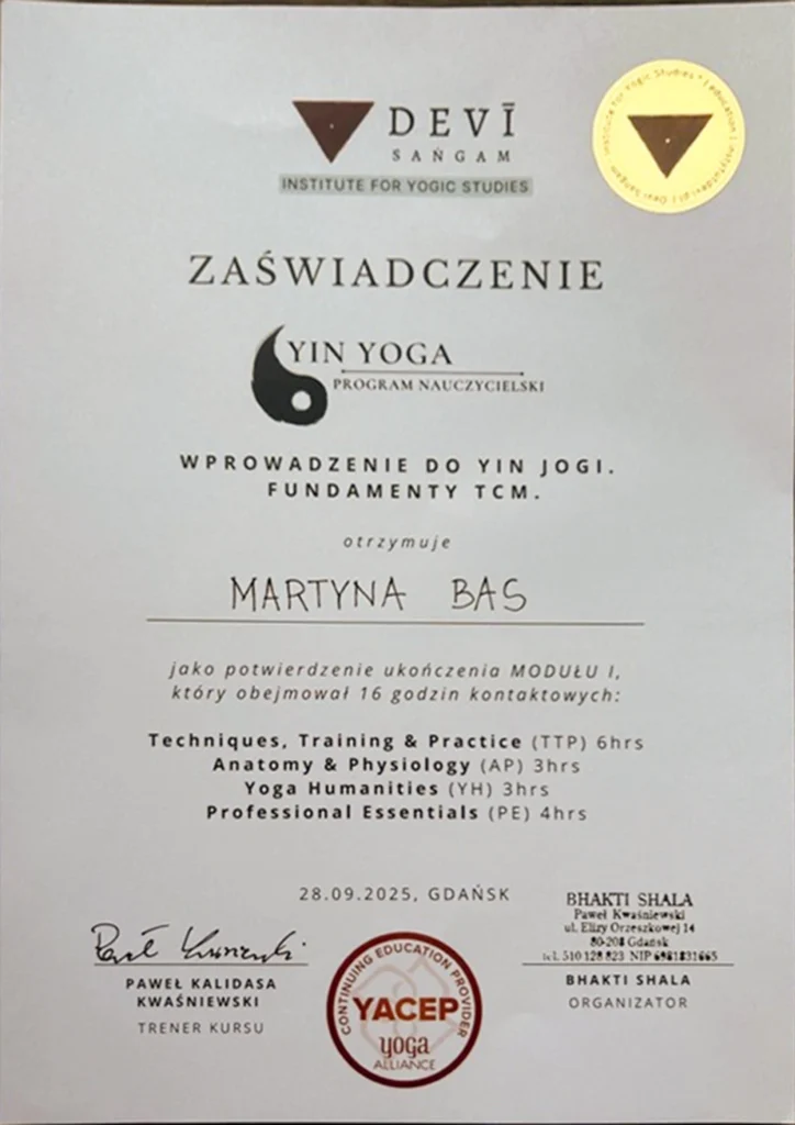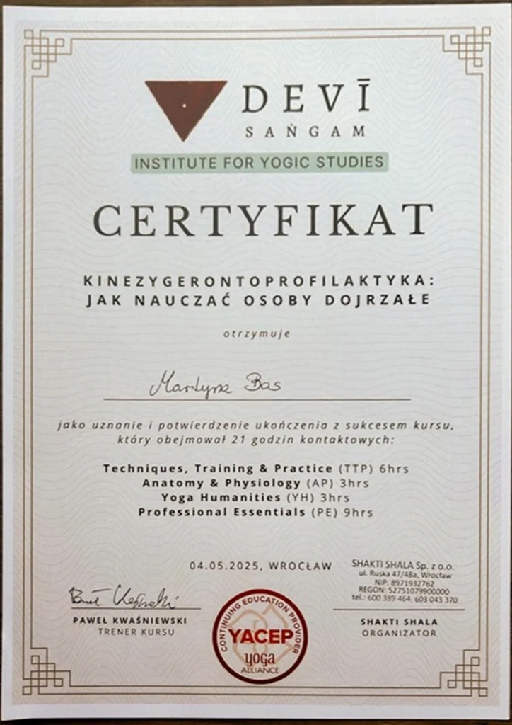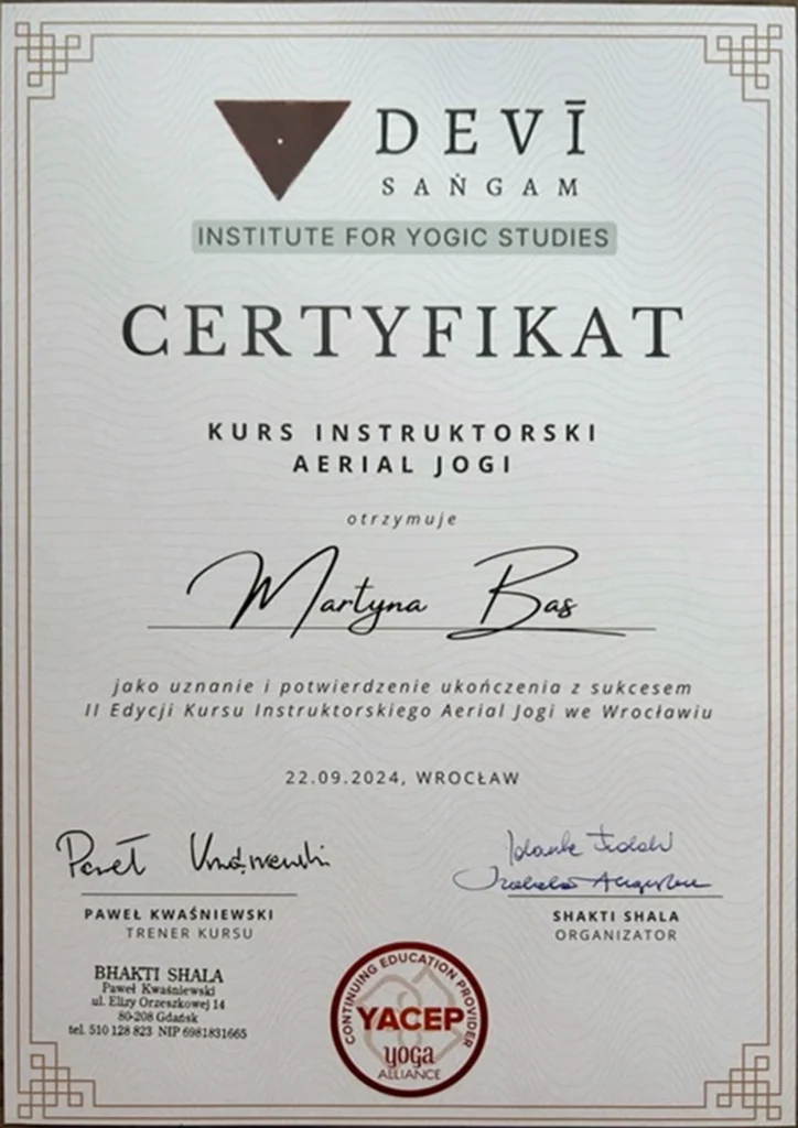 Ukończyłam studia podyplomowe z zakresu arteterapii (choreoterapii), co pozwala mi jeszcze pełniej pracować z ciałem jako przestrzenią, w której zapisują się emocje i doświadczenia. Jestem również certyfikowaną instruktorką aerial jogi, jogi dla seniorów oraz yin jogi. Nieustannie rozwijam swoją praktykę i wiedzę, uczestnicząc w warsztatach i szkoleniach, aby jeszcze lepiej wspierać osoby, z którymi pracuję.